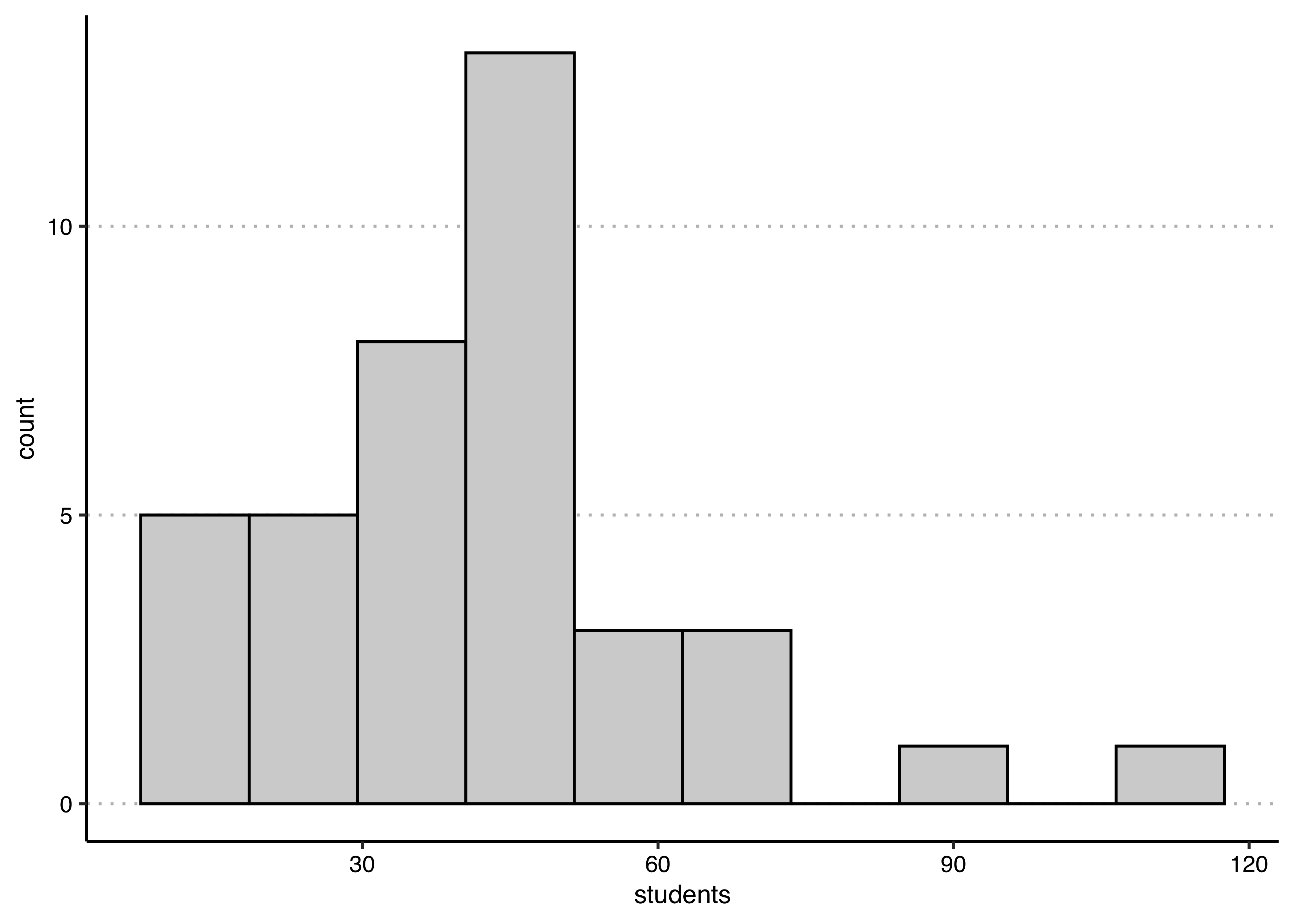 - We are now going to think about what statistic is most relevant at capturing the student experience. To constrain the problem a bit, let’s think in terms of some kind of average/mean. Where \(m\) is the number of classes taught, and \(\textrm{s}_j\) is the size / number of students of class \(j\), the mean class size statistic is: \[ A_1 = \frac{\sum_{j=1}^m \textrm{s}_j}{m} \] Come up with a “toy example” that illustrates why this could be a very bad representation of students’ experience of class size. Make your example as simple as possible to illustrate the problem and explain what the problem is.