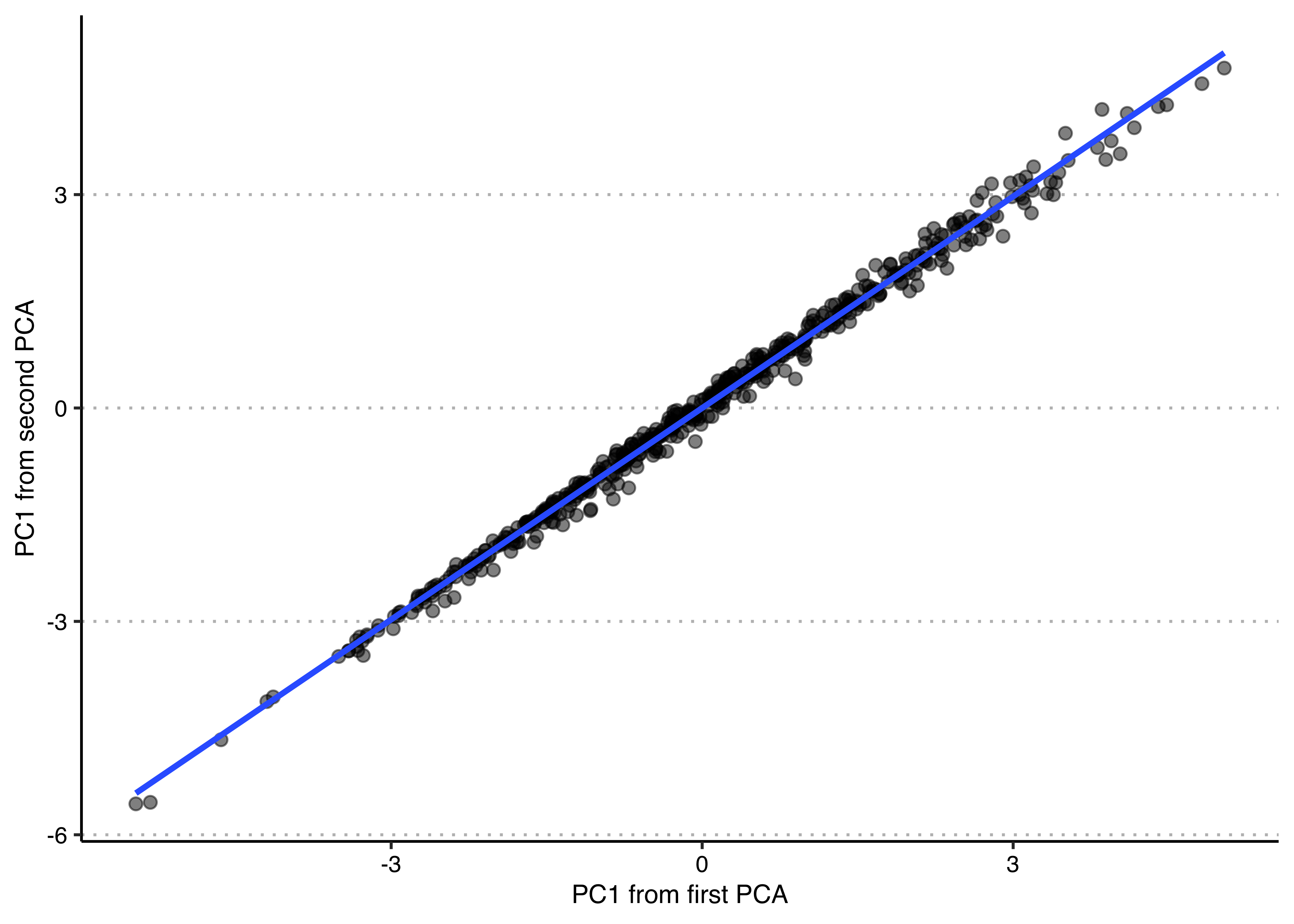 xlab("PC1 from first PCA") + ylab("PC1 from second PCA") +