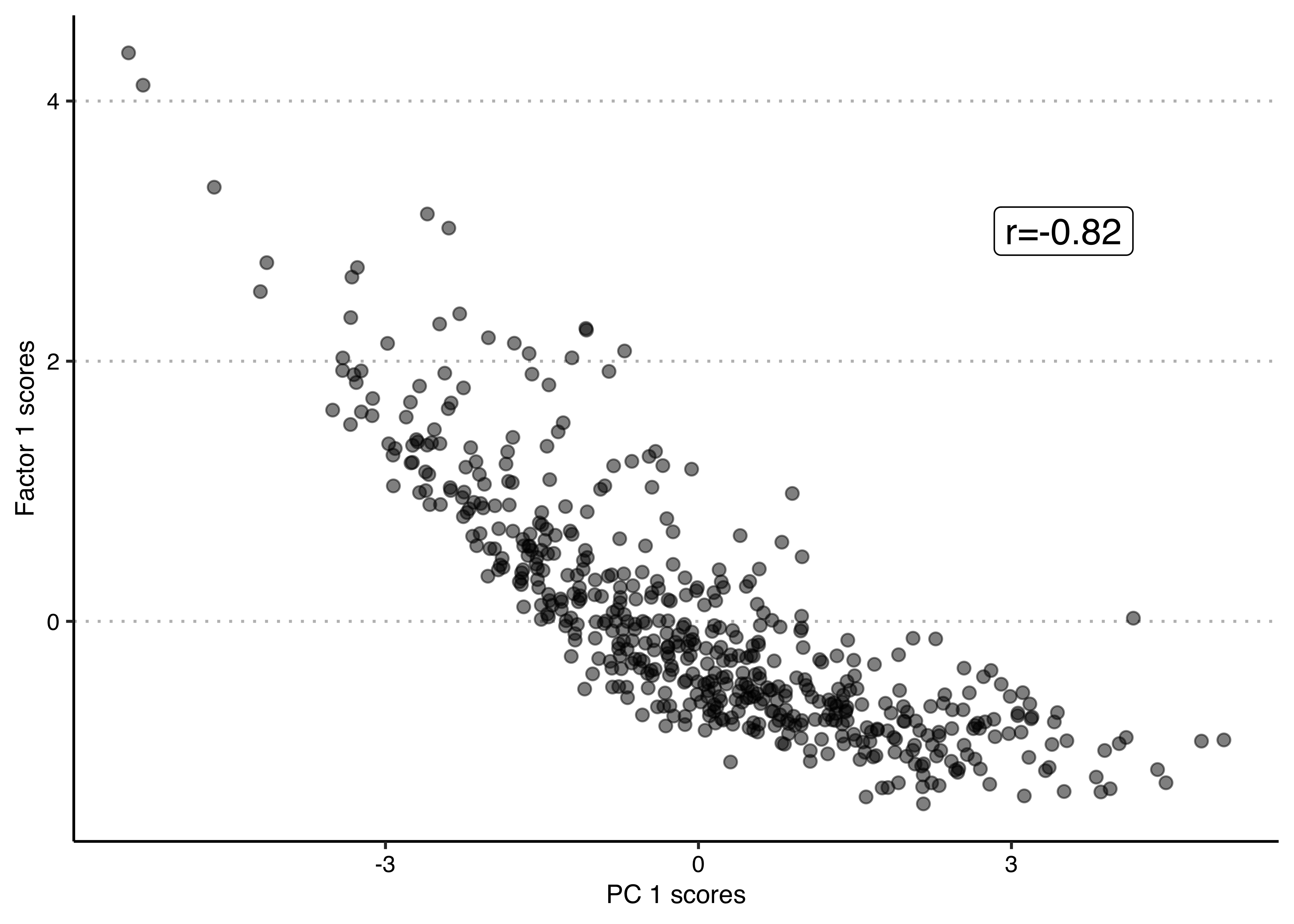 Looking at the loadings on the first factor, we see a very similar pattern than for the first PC above – only with the signs flipped (remember that the sign/direction of a PC or of a factor is entirely arbitrary!) – with a very weak association with the unemployment rate change, negative associations with unemployment rate and deprivation index scores and positive associations with house-wage ratio, median wage and social mobility scores. We can also see that the first PC and the first factor are very similar by plotting the respective scores against each other. Evidently, they are quite highly correlated.